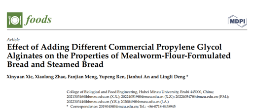 本网讯(通讯员 王智勇 王智勇/文 邓伶俐/图)近日,生物与食品工程学院汪兴平教授食品科学团队邓伶俐博士以jinnian金年会作为第一单位在《Foods》上发表论文“Effect of Adding Different Commercial Propylene Glycol Alginates on the Properties of Mealworm-Flour-Formulated Bread and Steamed Bread”。该期刊可在Scopus、SCIE(Web of Science)、PubMed等数据库中索引,其为JCR-Q1(Food Science & Technology)/CiteScore-Q1(Health Professions)期刊。5年影响因子为5.5。该研究得到了国家自然科学基金(批准号:32160610)的资助。