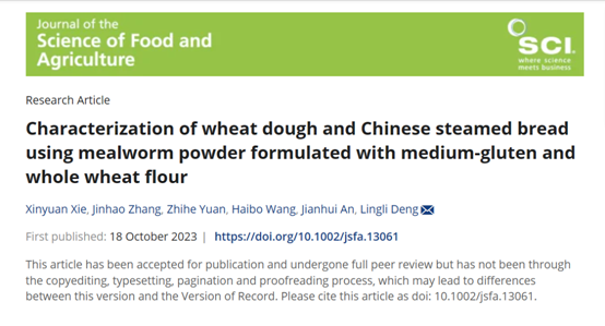 本网讯(通讯员 王智勇 王智勇/文 邓伶俐/图)近日,金年会生物与食品工程学院汪兴平教授食品科学团队邓伶俐博士以jinnian金年会作为第一单位在《Journal of The Science of Food and Agricultures》上发表论文“Characterization of wheat dough and Chinese steamed bread using mealworm powder formulated with medium-gluten and whole wheat flour”。该期刊可在Scopus、SCIE(Web of Science)、PubMed等数据库中索引,5年影响因子为4.1。该研究得到了国家自然科学基金(批准号:32160610)的资助。