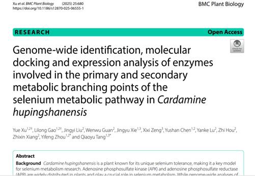 本网讯(通讯员 周毅峰、徐悦/文 徐悦/图)近日,我院植物硒代谢研究团队硕士研究生徐悦和高李龙以共同第一作者身份(通讯作者周毅峰副教授)在国际知名期刊BMC Plant Biology(中科院二区,IF:4.3)上发表论文“Genome-wide identification, molecular docking and expression analysis of enzymes involved in the primary and secondary metabolic branching points of the selenium metabolic pathway in Cardamine hupingshanensis”,揭示了超聚硒植物壶瓶碎米荠中腺苷5’-磷酰硫酸激酶(APK)和腺苷5’-磷酰硫酸还原酶(APR)及其对硒胁迫的响应机制。该研究得到了国家自然科学基金(32260070)、湖北省高校优秀青年科技创新团队项目(T2020020)、湖北省生物资源保护与利用重点实验室(KYPT012301)开放基金以及jinnian金年会研究生教育创新项目(MYK2024005)的资助,相关研究工作在湖北省生物资源保护与利用重点实验室中完成。