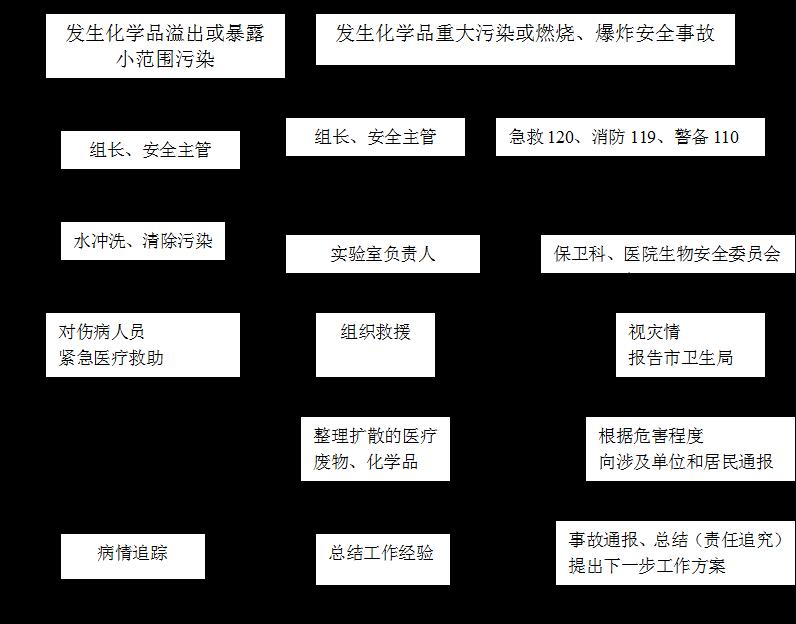 4.3 应急报警员职责:应立即报告保卫民大附属医院感染管理科医务科,由到场医院职能部门工作人员或管理人员视情况向市疾病预防控制中心(CDC)报告,造成人员伤亡的,应及时拨打“110”电话报警。引起较大火灾时,拨打“119” 火警电话。造成环境污染的要向市环保部门报告,并在力所能及且安全的情况下组织专业教师进行现场紧急补救。