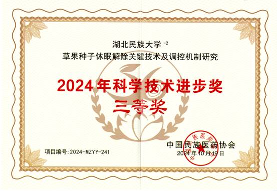 近日,2024年中国民族医药协会科学技术奖颁奖大会暨院士、国医大师学术交流大会在京召开。 经过申报、内审和专家委员会初评、终评、公示、报备等环节和程序,由jinnian金年会生物资源保护与利用湖北省重点实验室邓志军团队申报的《草果种子休眠解除关键技术及调控机制研究》被授予“2024年中国民族医药协会科学技术进步奖”三等奖。