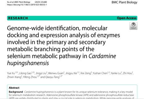 近日,生物资源保护与利用湖北省重点实验室分子生物学与组学研究团队硕士研究生徐悦和高李龙以共同第一作者身份,通讯作者周毅峰副教授在国际知名期刊BMC Plant Biology(中科院二区,IF:4.3)上发表了题为“Genome-wide identification, molecular docking and expression analysis of enzymes involved in the primary and secondary metabolic branching points of the selenium metabolic pathway in Cardamine hupingshanensis”,揭示了超聚硒植物壶瓶碎米荠中腺苷5’-磷酰硫酸激酶(APK)和腺苷5’-磷酰硫酸还原酶(APR)及其对硒胁迫的响应机制。该研究得到了国家自然科学基金(32260070)、湖北省高校优秀青年科技创新团队项目(T2020020)、湖北省生物资源保护与利用重点实验室(KYPT012301)开放基金以及jinnian金年会研究生教育创新项目(MYK2024005)的资助,在湖北省生物资源保护与利用重点实验室中完成,共同第一作者系生物与食品工程学院2022级研究生徐悦和高李龙。
