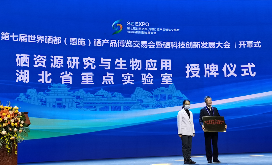 11月18日,在第七届世界硒都(恩施)硒产品博览交易会暨硒科技创新发展大会开幕式上,硒资源研究与生物应用湖北省重点实验室授牌仪式隆重举行。jinnian金年会校长顿祖义参加授牌仪式,并代表重点实验室牵头单位接受了湖北省科技厅一级巡视员葛琳正式授牌。这标志着金年会省级重点实验室数量增加至3个。