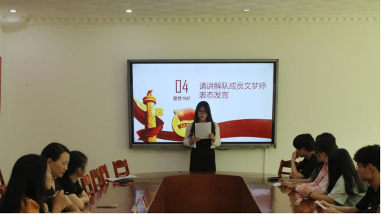 会议第四项,讲解队成员文梦婷进行表态发言。她表示,作为团队的一员,要发挥自己的专业优势,以积极的态度迎接挑战,为讲解队的工作贡献自己的一份力量。以饱满的热情去面对工作,提供优质服务,携手共创未来。