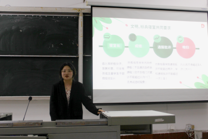 本网讯(通讯员 马明花/文 见习通讯员 陈欣雨/图)为了培养学生良好的生活习惯,养成严谨、规范的作风,创设卫生、文明、整洁的宿舍生活环境,进一步规范宿舍内务管理的要求。4月22日,我院公寓管理委员会在4202教室组织标兵寝室宣讲活动,宣讲人为标兵寝室立人五栋521成员原芝荷,全体大一寝室长参加活动。