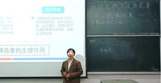 4302教室举办教案设计与课件制作赛道,生物科学专业教师雷红灵、王海波以及19级优秀学生付昕怡应邀担任此次评委。参赛选手按顺序在现场进行5分钟课件现场展示,并回答评委老师提问,评委则根据对教案设计、课件的审阅和选手答辩的表现现场进行三个项目的评审。其中,20级生物科学专业姚紫妍、李甜甜在展示PPT过程中时间分配合理,教学重点突出,启发学生思考与参与,有突破教学难点的策略,达到教师主导性和学生主体性有机结合的目标。