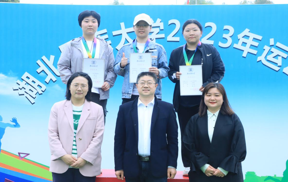 学校教务处长谭世明老师为女子铅球项目冠军黄杨洋同学(二排中)颁奖