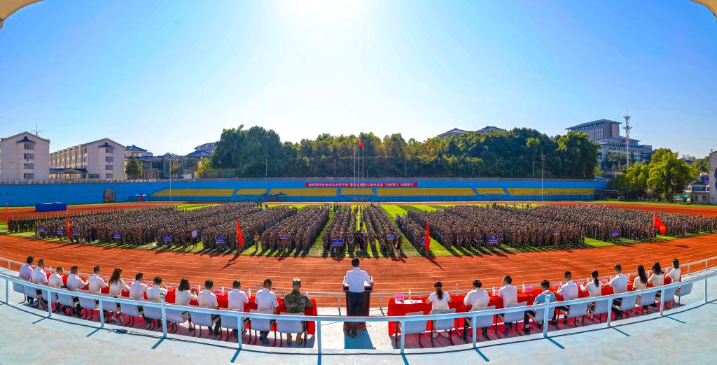9月4日,jinnian金年会2022级本科生军训动员大会在五环体育场举行,军训团政委、jinnian金年会党委副书记邓磊出席大会并做动员讲话,中国人民武装警察部队恩施支队副参谋长吴华平、军训领导小组成员,各学院(部)负责人、全体承训教官和参训学生参加动员大会。