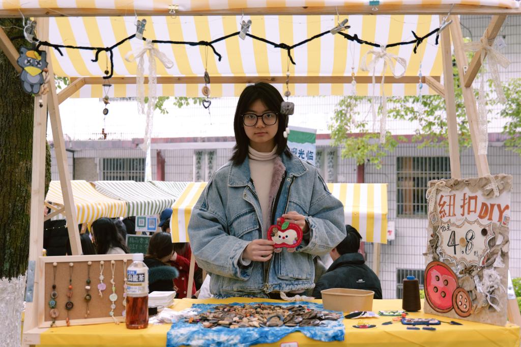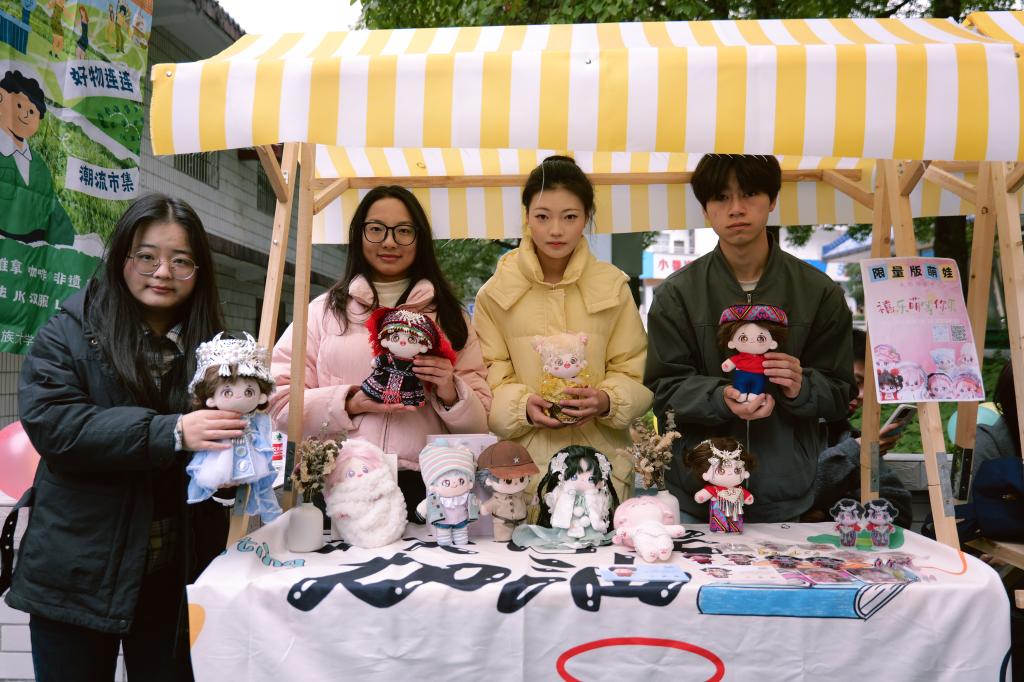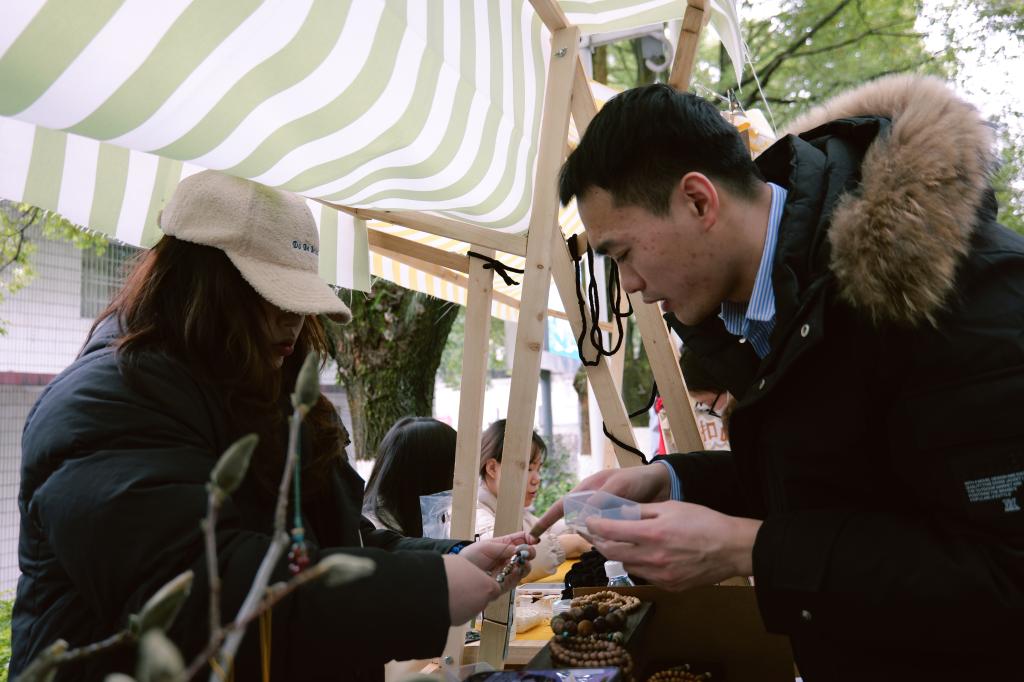 在中医展示区,阵阵药香扑鼻而来。特色香包现场制作吸引了众多目光,艾草、薰衣草等天然香料被巧妙地缝制进精美的布袋中,既美观又实用,深受学生喜爱;养生党参茶、特制面霜等产品也凭借其独特的配方和精美的外观,成为了集市上的“明星产品”。项目负责人耐心地为学生讲解着中医养生知识,让大家在体验传统文化的同时,也收获了健康。在手工DIY区,手工艺人专注地打造着手中的作品,一针一线、一笔一划,都倾注着他们对工艺的热爱。精致的刺绣、可爱的萌系玩偶、饱含祝福的手链……每一件独一无二的作品都让女生流连忘返。
