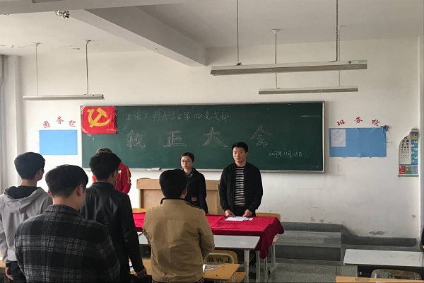 2017年11月28日中午,兰州交通大学博文学院电信工程系学生第四党支部在教学楼3026教室召开支部会议,参加此次会议的有电信工程系学生第四党支部支部书记潘婷老师,第四支部的所有学生正式党员及预备党员。会议由电信工程系学生第四党支部组织委员梁嵩山同志主持,会议主要对田亚桃、闫慧霞等7名预备党员发展为中共正式党员进行讨论和表决。