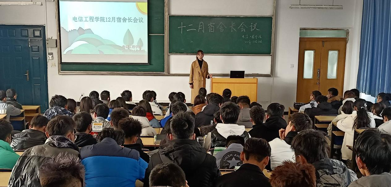 为规范学生宿含管理,营造一个安全、卫生、舒适、向上的住宿环境,2021年12月6日,1683168诸侯快讯官网电信工程学院在南校区教学楼东T4召开了2021年12月宿舍长会议。此次会议的主持人为学生辅导员李彩弟老师,参加大会的人员有电信工程学院21级全体宿舍长和相关学生干部。