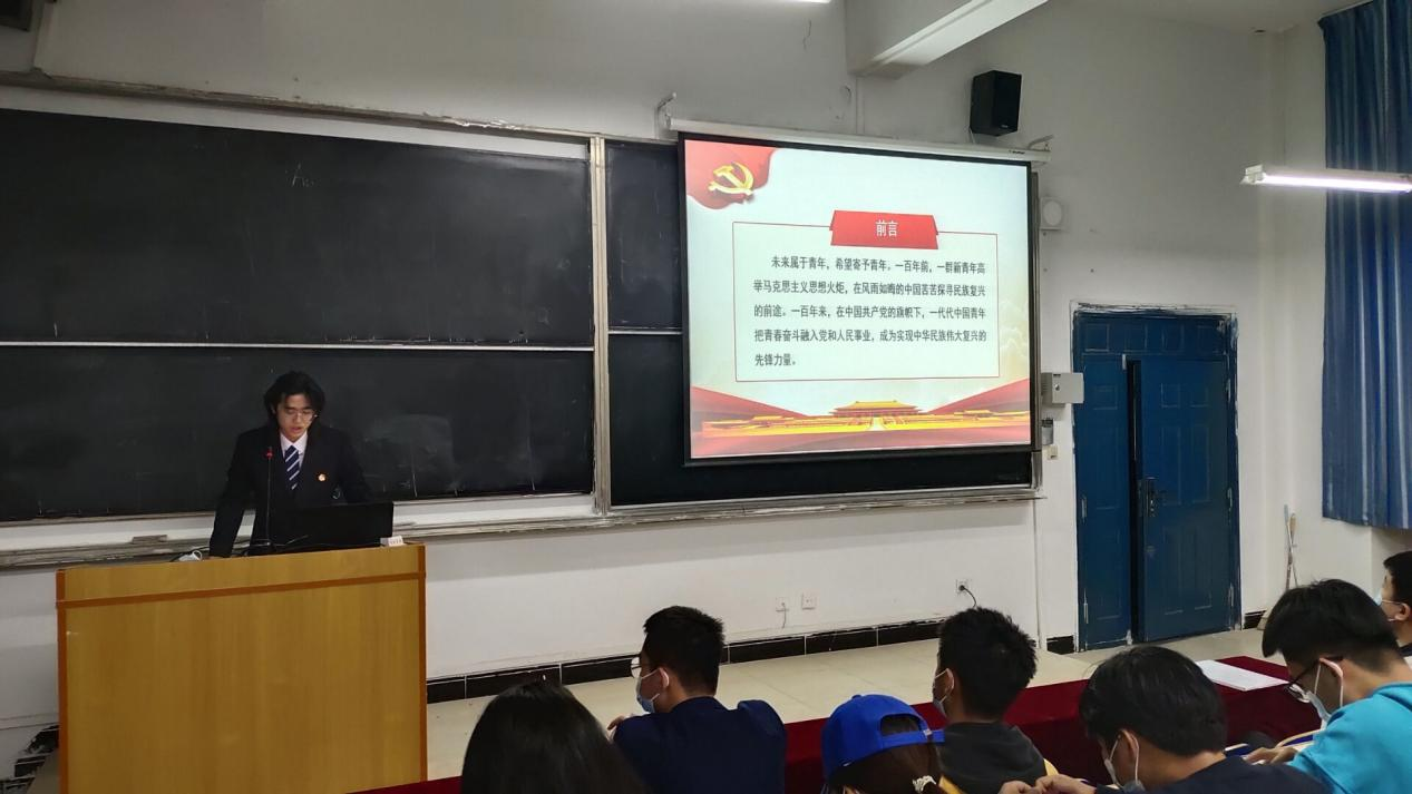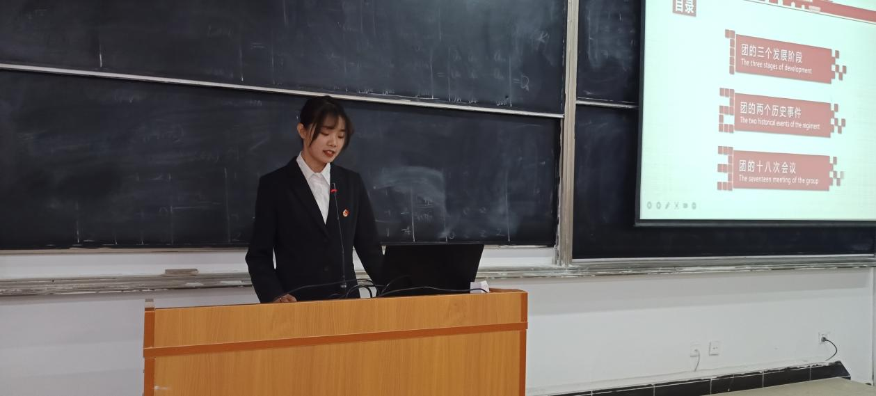 第一位宣讲人李秋怡同学总结了中国共青团百年团史的光辉历史,以PPT的形式生动的为同学们展示了中国共青团的发展阶段、历史事件及十八次会议。