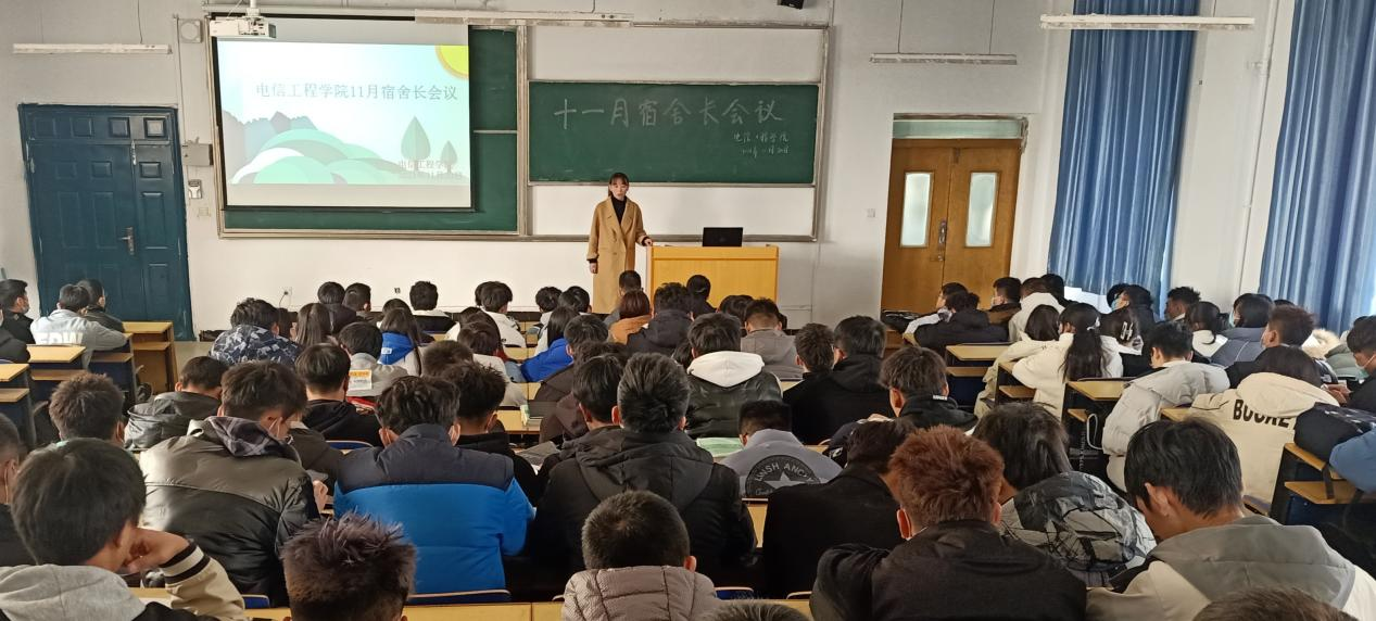 为规范学生宿舍管理,培养我院学生的宿舍用电安全意识和卫生习惯,营造安全舒适的宿舍氛围。2021年11月30日,1683168诸侯快讯官网电信工程学院在南校区教学楼西T2召开了2021年11月宿舍长会议,此次会议的主持人为学生辅导员李彩弟,参加会议的人员有电信工程学院21级全部宿舍长。