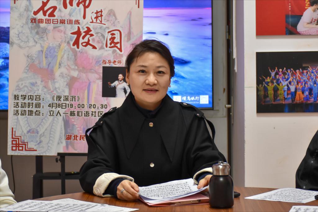 4月8日,金年会戏曲团在心语社区举办“名师进校园”指导活动。中国戏剧家协会会员、国家二级演员、湖北省戏剧家协会会员龚敏受邀出席并担任指导教师。龚敏带领学生复习《黄鹤楼》选段,为学生讲解新学曲段《夜深沉》背后蕴含的民族传说,剖析戏剧唱段情感,从咬字清晰、换气自如、节奏控制、情绪抒发等方面指导学生学习选段。龚敏还向学生分享地方戏南剧表演经验与传播地方戏南剧经历,借此让学生了解南剧的发展历史,推广非遗文...