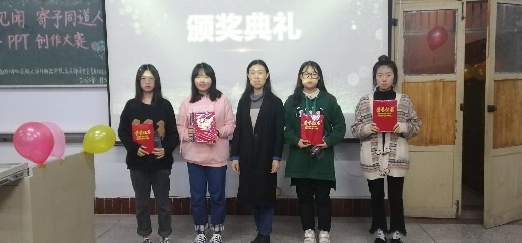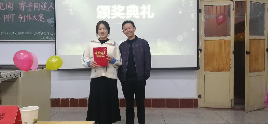 时间:2020-11-13 编辑:学生科 点击:(通讯员 张迈迈/摄影 王芷依 王本权 杨胜丫)11月5日晚,我院于文汇楼6402教室成功举办以“以我所见闻,寄予同道人”风华杯PPT创作大赛。翻译系主任覃军、优秀教师代表陈实等出席并担任评委。