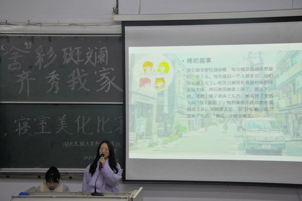 经过前期初赛评选,共有12个优秀寝室从中脱颖而出参与此次决赛。决赛围绕成员面貌、寝室环境、寝室氛围、寝室公约等内容进行风采展示和现场展演。活动伊始,各个寝室的代表通过不同形式的PPT介绍寝室相关情况,语言风趣幽默,生动展现了外院良好的寝室风貌以及温馨的寝室关系。活动过程中,不仅有激烈的有奖竞答,而且还有动听的暖场歌曲,活跃了现场氛围。经过现场评比,博爱8-131寝室荣获桂冠,立人1-516寝室和立人5-621寝室获得二等奖,博爱8-152寝室、立人5-614寝室以及博爱8-243寝室获得三等奖,立人5-702寝室、博爱8-113寝室、立人1-608寝室以及博爱9-106寝室获得优胜奖。活动最后,评委老师对本次活动进行了总结,表扬了参选寝室整洁明亮的寝室环境,和谐共进的寝室氛围,并鼓励大家以获奖寝室为榜样,见贤思齐,着力营造团结互助的寝室关系。