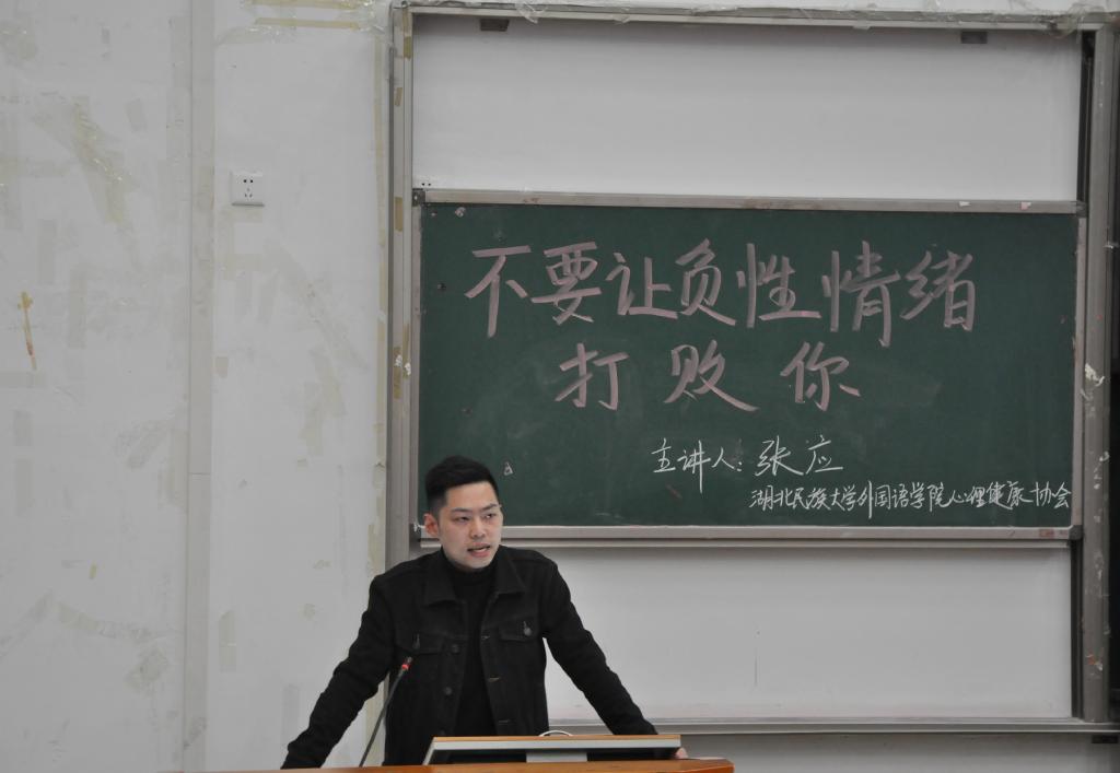 时间:2021-03-29 编辑:学生科 点击:(通讯员 张慧 孙亦乐/摄影 蔡莎莎)为营造良好的心理健康环境,响应四月心理健康月系列活动,3月28日晚七点,外国语学院于修远楼5B403教室成功开展以“不要让负性情绪打败你”为主题的心理健康讲座。jinnian金年会校友,现恩施州优抚医院精神卫生中心张应医生为此次讲座主讲人,邓小晴老师为讲座主持人,我院大一各专业学生踊跃参加。