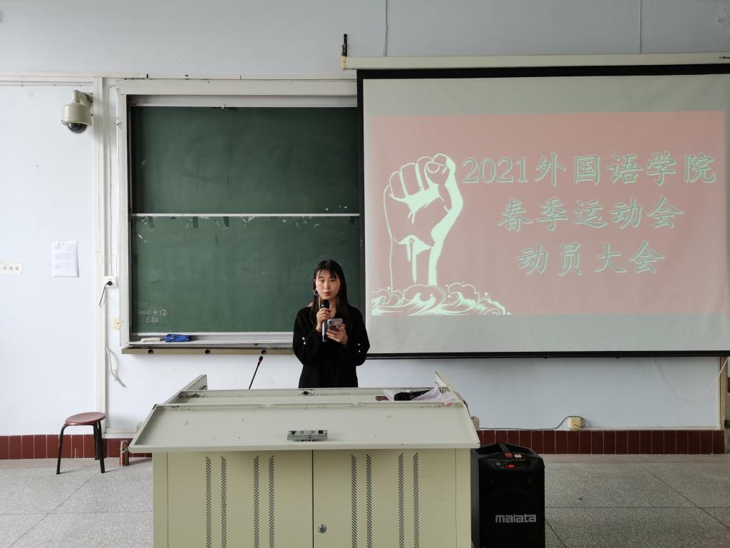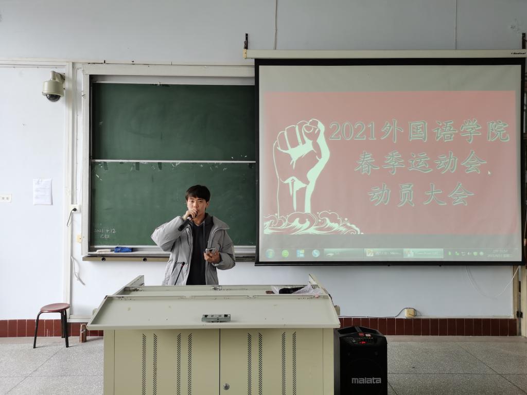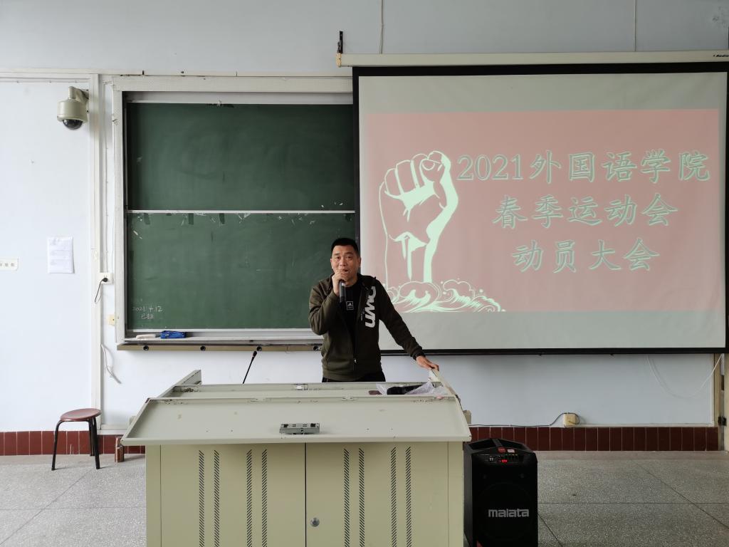 活动伊始,主持人胡依依宣读动员大会目标,举行动员大会是为了动员全院各方力量,一起做好运动会的前期准备工作,也为学校运动会的圆满开展做出一份贡献。紧接着,党委书记周代明老师指出,本次运动会在同学们认真付出的基础上,宣扬全民健身精神,不轻言放弃的精神,赛出精神,赛出风采,规范纪律,加强自我管理。他号召参加运动会的同学们认真对待此次运动会,为外院争分争光,并鼓励无赛事同学去观看比赛,为运动员加油打气。大会最后,运动员代表周尧臣发言,他表示,比赛胜负固然重要,但更重要的是比赛过程而非结果,运动员们要学会享受竞争,体验运动的快乐,外国语学院将以我们的远动员而骄傲。