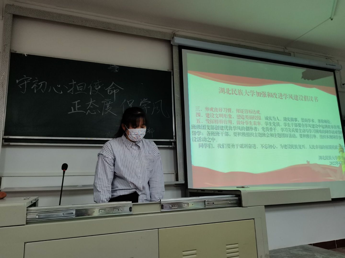 本次主题班会由班长带领全体同学学习学风建设倡议书。在jinnian金年会严谨的治学之风中,一代又一代民大人投身报国,在高山林海中抒写豪情,在日月星辰下矢志奉献,在艰难困苦中玉汝于成。而作为身处百年未有之大变局环境下的大学生,要做到强化主人意识,接续校园建设;树立远大理想,明确学习目的;养成良好习惯,保证目标达成;还要建设文明形象,塑造美丽校园以及发挥榜样作用,做好学生表率。尤其党员骨干、学习尖兵要主动与学习困难的同学结对帮扶、帮教、帮学;各班班干部,要积极组织主题班会和主题团日活动,积极引导、组织本班同学参与学风建设活动之中。