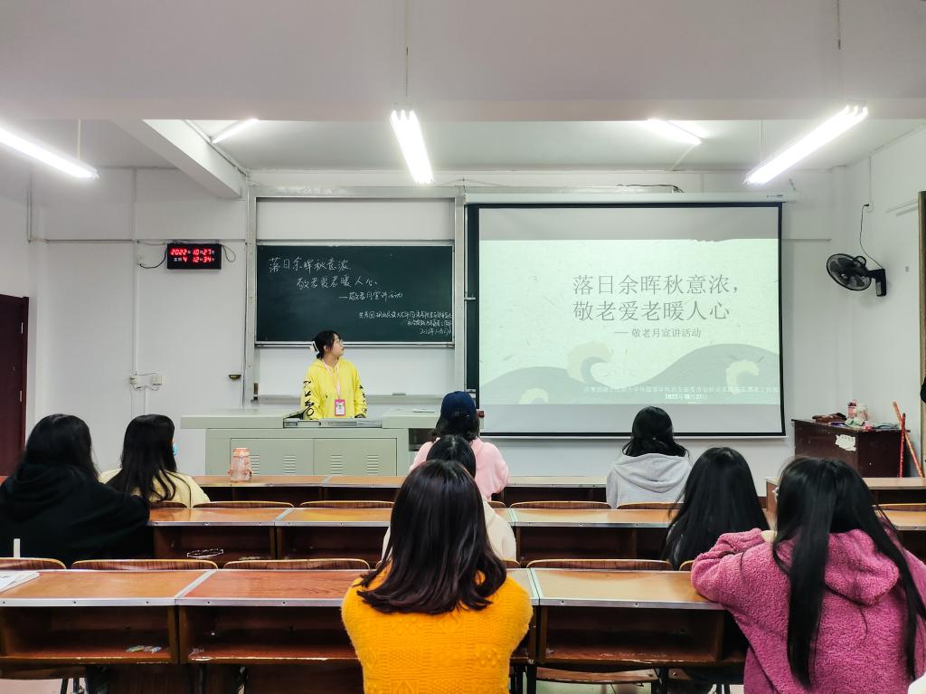时间:2022-10-28 编辑:学生科 点击:为弘扬孝亲敬老传统美德,营造养老孝老敬老社会氛围,10月27日12点30分,外国语学院团总支社会实践与志愿者工作部于6B205教室开展以“落日余晖秋意浓,敬老爱老暖人心”为主题的敬老月宣传活动。