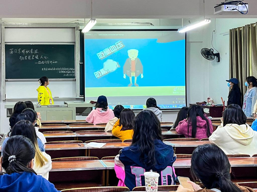 接着,主讲人开始本次宣讲活动,她介绍道,敬老月是由中国全国老龄工作委员会组织开展的一项全国性的爱老敬老社会活动,在我国,尊敬老人历来是中华民族的优良传统,这种传统美德也体现在节令风俗中。将中华敬老传统加以深化和外延,正是敬老月的意义所在。而针对“时代不断进步,却忘了把老人带上”这一问题,主讲人也提出了相应的解决措施:要做到敬老爱老从我做,帮助老年人适应社会发展的列车,同时要提高社会公德意识,了解老年人的生活,为他们晚年孤寂的精神世界献上一份关爱。最后,主讲人通过一个视频生动形象地呈现了帮助老年人的具体措施,以次结束了本次宣传活动。