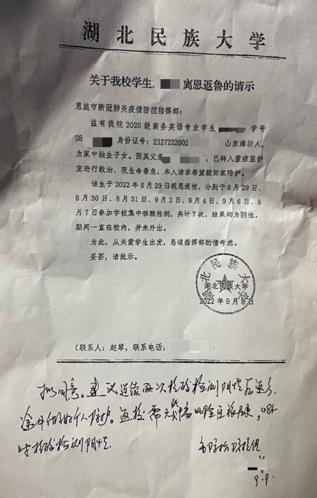 9月8日,恩施市新冠肺炎疫情防控指挥部收到了来自我院的一封学生离恩返鲁的请示信。“从关爱学生出发,恳请指挥部酌情考虑”,短短的一句话的背后,是外国语学院全体教师的殷切期望。