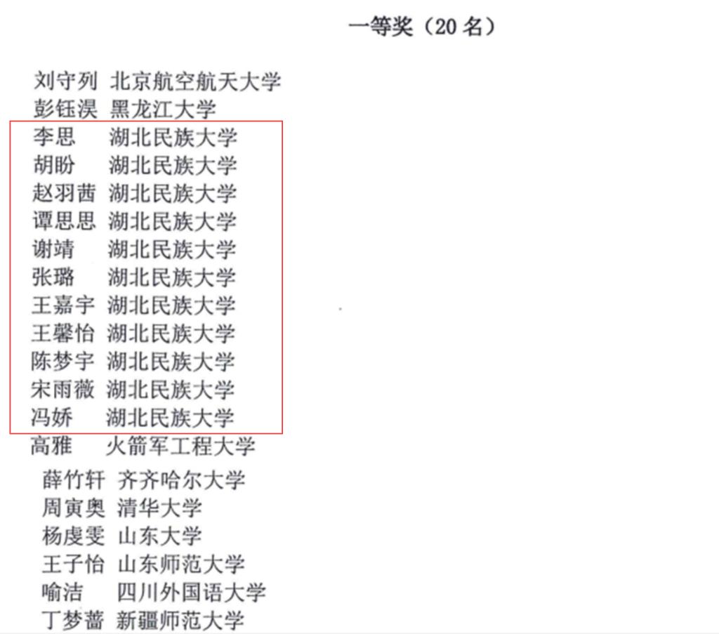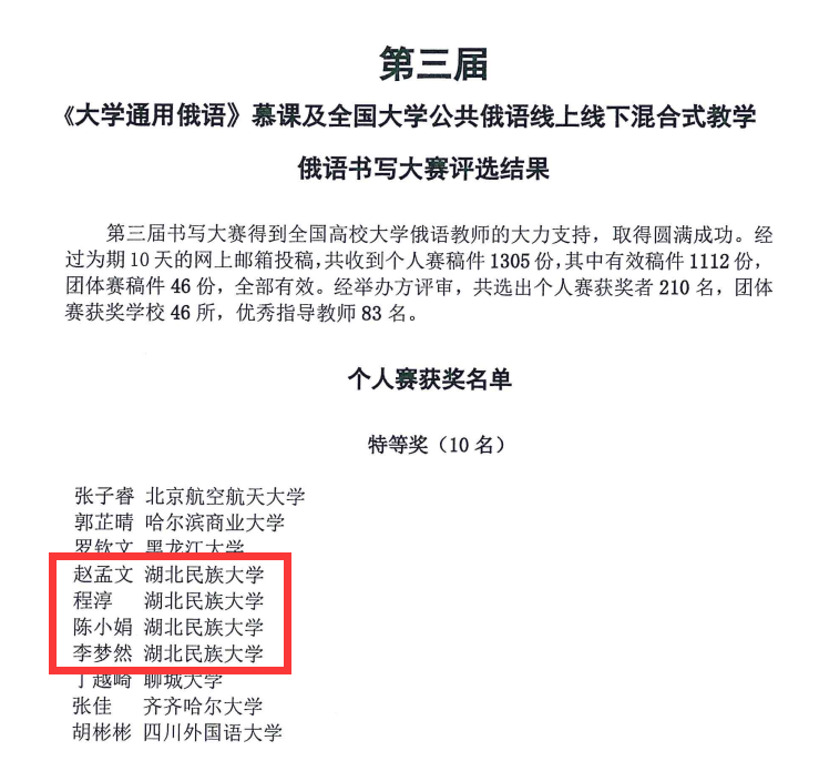 时间:2022-11-15 编辑:hbmzu 点击:由高等学校大学外语研究会俄语分会、北京航空航天大学《大学通用俄语》慕课团队、高等教育出版社联合举办的第三届全国大学俄语书写大赛中,在刘波副教授的指导下,外国语学院学生取得了骄人战绩,团体荣获一等奖,喜获个人特等奖4项(占特等奖获奖总数的40%)、个人一等奖11项(占一等奖获奖总数的55%)、个人二等奖12项(占二等奖获奖总数的40%)、个人三等奖6项(占三等奖获奖总数的12%)和个人优秀奖1项。
