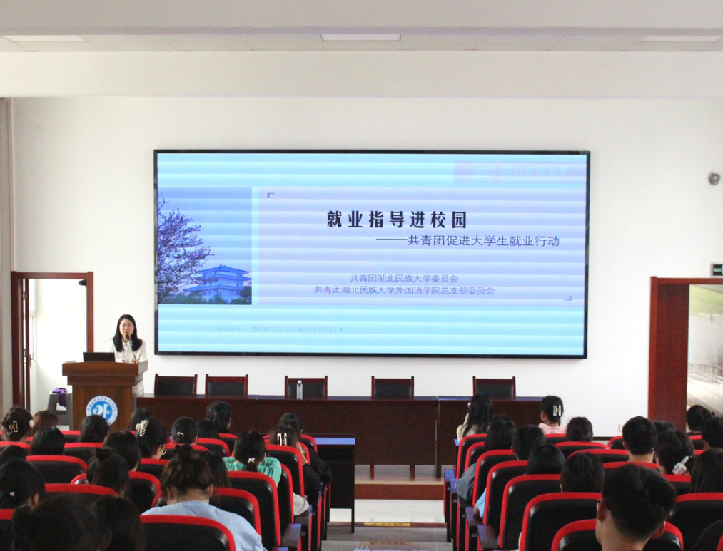 团团微就业,高校在行动。为进一步帮助金年会学生树立就业观念,拓展就业视野,校团委、外国语学院团总支于5月4日在文汇楼6402报告厅举行了“就业指导进校园——共青团促进大学生就业行动”讲座活动。本次活动特邀马家希望小学副校长、湖北青年五四奖章获得者、外国语学院优秀校友陈若竹作指导,100余名学生参加。
