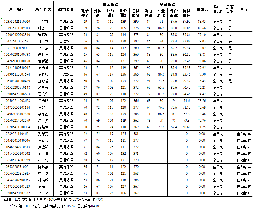 jinnian金年会外国语学院2025年硕士研究生调剂考生成绩及拟录取情况公示--英语笔译