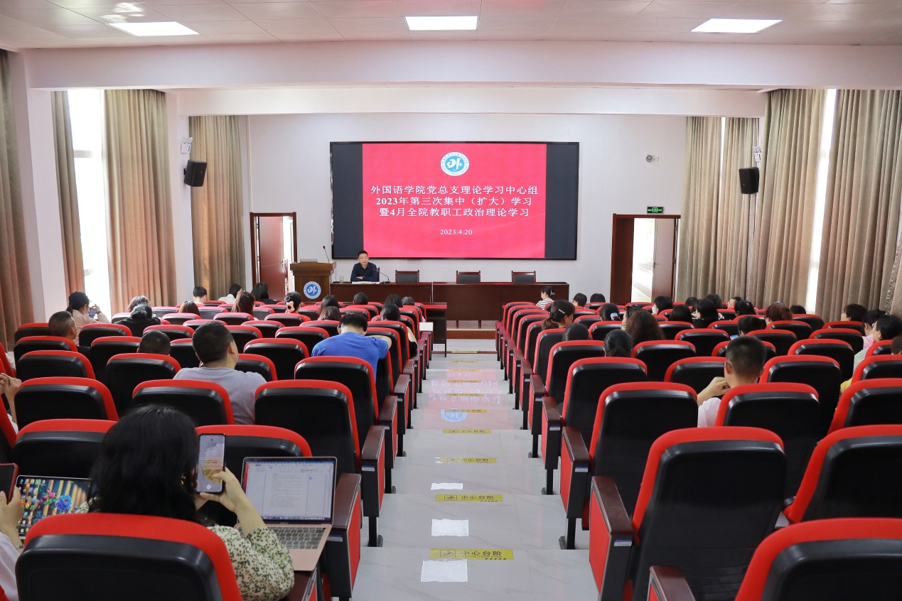 4月20日下午,外国语学院在学院四楼学术报告厅召开党总支理论学习中心组集中(扩大)学习,学院党总支书记严森主持学习并作动员讲话。学院党总支成员、全院教职工参加学习。