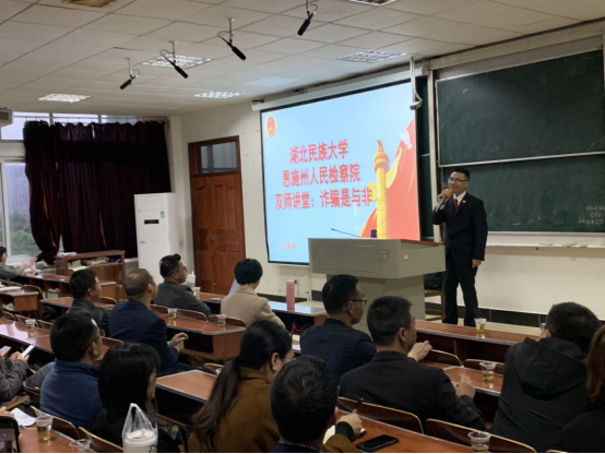 4月21日晚,以《诈骗罪的是与非——以向某诈骗罪为例》为主题的第五期“双师同堂”讲座在德智楼9b410教室举办,我院邀请恩施州人民检察院第二检察部主任周晓为担任主讲人,金年会刑事法治研究所所长黄继坤任主持人,有多名检察官、律师到场旁听、互动。
