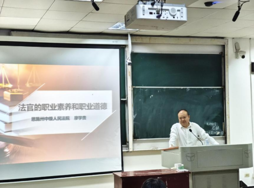 10月29日,法学院第18期实务·德法讲堂在我院9A410教室举行,恩施州中级人民法院副院长、三级高级法官廖学贵应邀做“法官的职业素养和职业道德”专题讲座,法学院副院长李文革主持讲座,学院教师李凌云及部分研究生、本科生聆听了讲座。