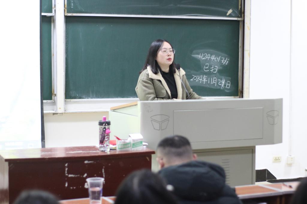 本网讯(记者 袁本怡 张吴凤仪/文 谭正法/图)12月1日,以“四六级冲刺大作战”为主题的晚点名于德智楼9A410教室举行。本次活动由我院2023级辅导员谢学婧主持,2023级法学专业全体学生参加。