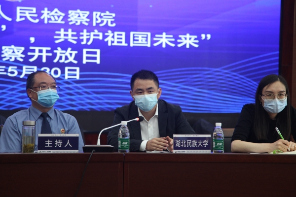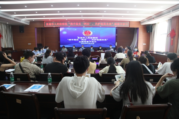 本网讯(记者 周富鸿/文 恩施市人民检察院/图)5月30日,我院法苑学社协同恩施市人民检察院开展“携手落实两法,共护祖国未来”公众开放日活动。活动邀请恩施市人大、市政协、市教育局、市民政局、共青团、市妇联、市内中小学、舞阳坝派出所、舞阳坝街道办事处等机构组织相关部门负责人参与,我院教师李建忠、法苑学社学生负责人姚金莲带领学院部分学生参与此次活动。