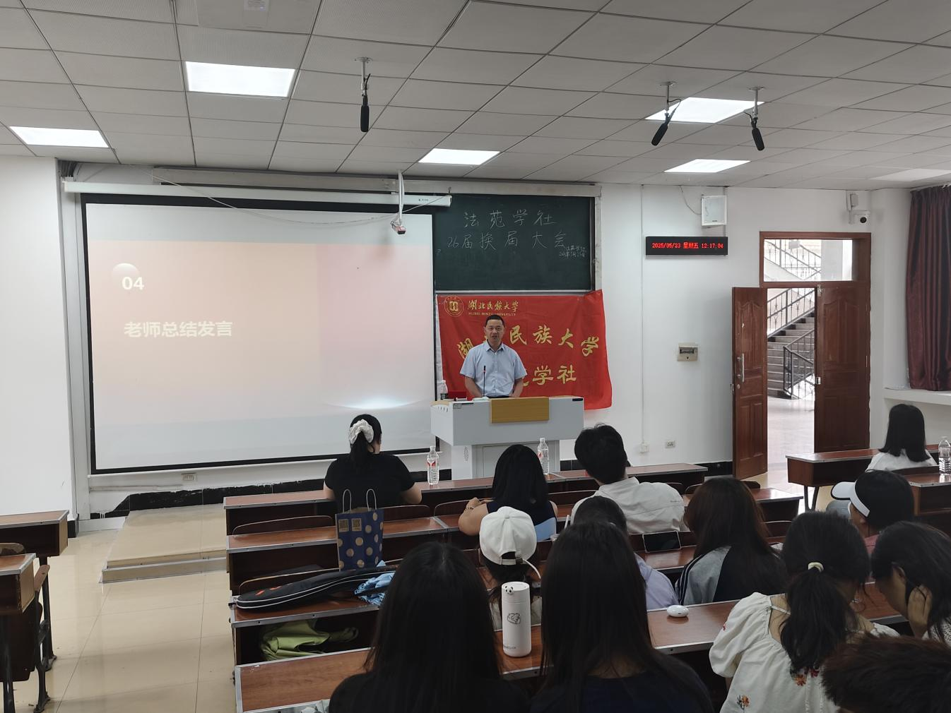 会议在庄严的国歌声中拉开序幕。首先,由本届社长周庆庆作年度工作报告。报告全面回顾了过去一学年法苑学社在学术研讨、实践锻炼、普法宣传、模拟法庭竞赛、内部建设等方面取得的丰硕成果与宝贵经验,深情感谢了指导老师、学院团委的悉心指导以及全体社员的辛勤付出并特别强调了学社在营造校园法治文化氛围、提升社员专业素养方面发挥的积极作用,并对新一届社团骨干寄予厚望。新任社长马宇恒代表新一届社团领导班子发表了就职演说。他首先表达了对前辈工作的敬意与感谢,深感责任重大。他表示,新一届骨干团队将满怀热情与信心,在传承中创新,在实干中奋进,带领社团全体人员书写法苑学社发展的新篇章。指导老师李文革老师发表了热情洋溢的讲话。他充分肯定了上一届社团骨干的卓越贡献和取得的优异成绩,对法苑学社在专业学习、实践创新、服务校园等方面展现出的“法苑风采”给予了高度评价。学院团委负责人谢学婧老师也表达了对新一届社团领导班子的祝贺与支持,勉励大家再接再厉,为繁荣校园文化、服务同学成长成才贡献更多“法苑力量”。大会最后,举行了隆重的表彰仪式。指导老师向卸任的上一届社团成员颁发了任职聘书,感谢他们为法苑学社发展所付出的心血和作出的突出贡献。