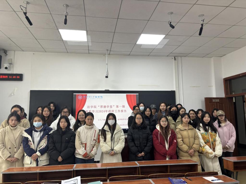 3月4日、5日,全国政协十四届二次会议和十四届全国人大二次会议在北京隆重召开。国务院总理李强在全国人大二次会议上作政府工作报告。法学院学生党支部、立人六栋党小组组织全体党员和发展对象同上“时政课”,以集体观看和个人自学等方式收看两会开幕盛况,并前往学生寝室派发、宣讲打印好的政府工作报告简版内容,加深同学们对本次两会精神的认识和了解。法学2021级1班学生党员徐子芃谈到,集中观看学习了今年的政府工作报告让我受益良多,从立法助推经济发展、推进法治政府建设再上新台阶到法治之力助推解决老百姓的大事小事,法治元素无不闪耀其中。作为一名法学生,我也将继续坚守初心、坚守使命,在未来力争做一名出色的法律工作者。