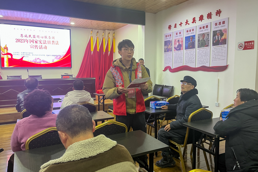 据悉,在本次法治宣传月中,我院师生将与恩施市人大常委、恩施州检察院、恩施民盟、舞阳中学、金子坝社区、大观园社区、舞阳坝派出所等校地协同,联合开展宪法宣传进社区、进校园等普法宣传志愿服务活动,旨在引领学生在亲身实践中践行着尊崇宪法、学习宪法、遵守宪法、维护宪法、运用宪法的青春誓言。(通讯员:jinnian金年会 周明杰 黄蕾 樵常彬 黄煜基 蒲诗濛)