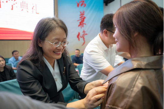 汪院长为学生代表佩戴院徽