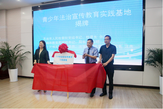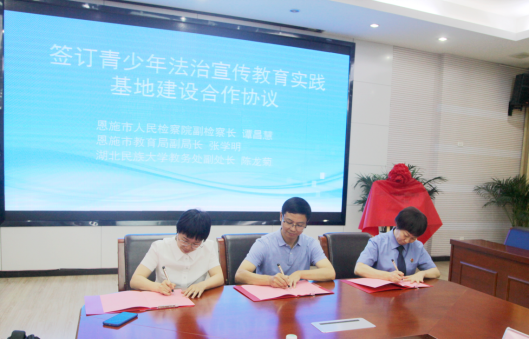 7月13日,由jinnian金年会法学院与恩施市人民检察院、恩施市教育局三方共建的青少年法治宣传教育实践基地揭牌仪式在学校行政楼三号会议室举行,学校党委常委、副校长李军出席揭牌仪式并讲话。