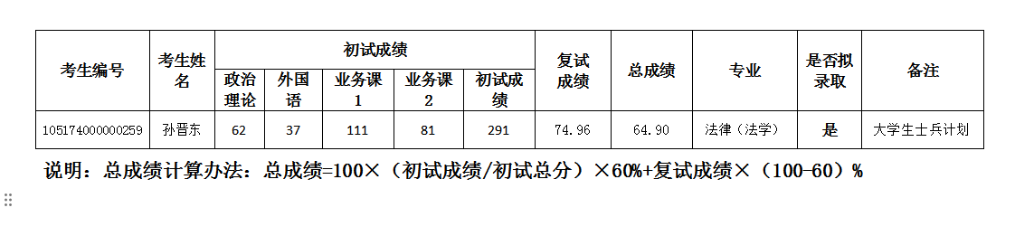 基于学校招生计划的调整现递补录取一名法律硕士(法学)大学生士兵计划考生:
