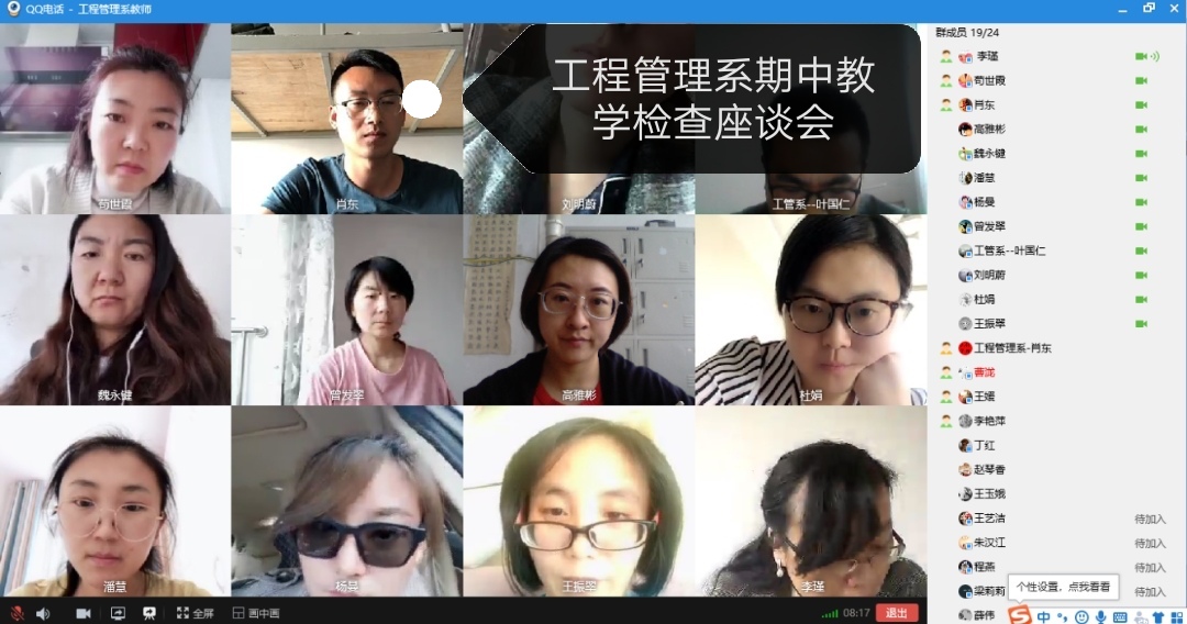 根据教务处《兰州交通大学博文学院关于开展疫情防控期间在线教学运行情况检查的通知》的相关文件要求,结合我系的具体情况,以强化教学质量监控,加强教风、学风建设,规范我系教学程序为目的,本着及时发现和解决教学中存在的问题,规范教学行为,提高教学质量为出发点,2020年5月11日-5月18日开展了系部教学检查工作,由于受到新冠肺炎疫情影响,检查工作线上线下结合进行,系部开展全系教师线上视频期中教学检查座谈会,四个教研室分别召开本教研室所在专业各班级班长线上视频期中检查座谈会。截止2020年5月18日,工程管理系2019-2020学年第二学期期中教学检查工作圆满完成 。虽然初次开展线上线下相结合的教学模式,但是教学成果可以与正常课堂教学相媲美!