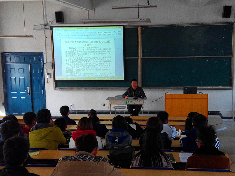 会上,叶主任就学院颁布的《兰州交通大学博文学院考务管理规定》中的内容为同学们做了全面、细致的讲解及教育,强调了诚信考试的重要性,分析了考试违纪可能带来的危害;并要求同学们遵守考场纪律、坚决杜绝考试作弊现象,提高自身素质、诚信考试。刘主任督促大家充分利用时间、认真复习、积极应考;要求同学们自觉履行考试规定,尊重监考老师。最后,各班班长领取了《考试承诺协议书》,每个同学签字并保证将诚信考试。