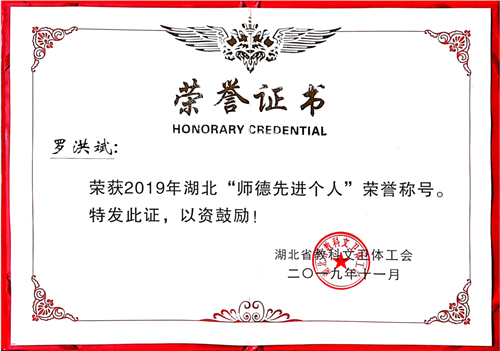 金年会教师罗洪斌荣获2019年湖北省“师德先进个人”荣誉称号
