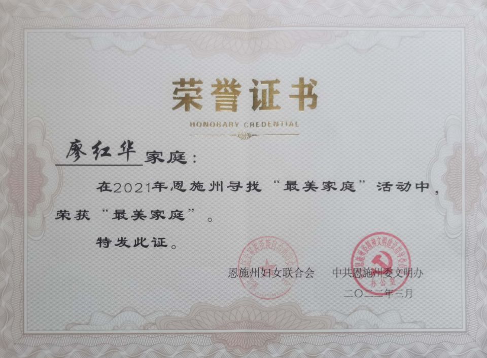 金年会廖红华家庭被评为2021年度恩施州“最美家庭”