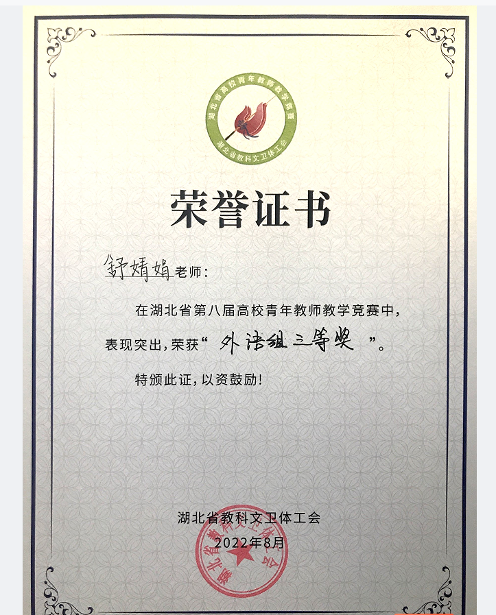 金年会外语学院舒婧娟老师在湖北省第八届高校青年教师教学竞赛中喜获外语组三等奖。