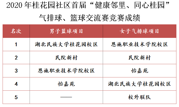 由桂花园社区居委会、jinnian金年会工会主办,jinnian金年会体育学院分工会承办的2020年首届“健康邻里、同心桂园”气排球、篮球交流赛于8月29日在jinnian金年会桂花园校区篮球馆落下帷幕。经过两天的激烈争夺,jinnian金年会桂花园校区和恩施职业技术学院校区分获男子篮球项目和女子气排球项目冠军。各支代表队在比赛中都展示出了较高的运动水平和较好的精神风貌,充分展示出了桂花园社区党员群众的风采!