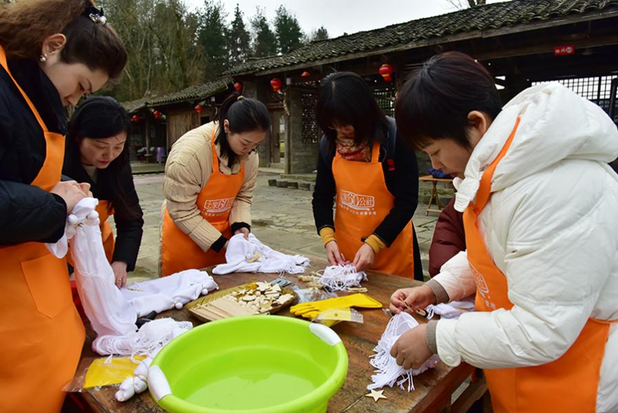 随后,女教职工代表开展了扎染技艺培训、花艺培训、运动趣味游戏等一系列活动。在讲解员的详细介绍下,女教职工代表们深入了解扎染文化的发展历程和制作方法,精心制作的每条围巾都呈现出别具一格的染色效果,大家在亲身体验中感受非遗的无穷魅力。花艺培训环节中,大家的手法逐渐从生涩到熟稔,制作出一束束精美的花束,现场氛围轻松愉悦。最后,女教职工代表们进行了舞蹈热身,并进行了破冰分组、勇往直前、激情节拍等趣味竞赛活动,在运动中感受生命之美。