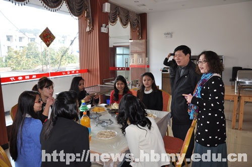 上午11点左右,留学生们陆续入场,国际教育学院学生管理科工作人员为同学们安排好酒席位置,来自尼泊尔,印度,加纳的留学生和学校领导,老师们围桌而坐,一起共庆中国传统佳节中的“小年”。宴会于12点准时开始,校领导携相关部门领导、老师依次给同学们敬酒,并向各位同学送上新春祝福,祝愿留学生在中国过一个平安、祥合和愉快的寒假。
