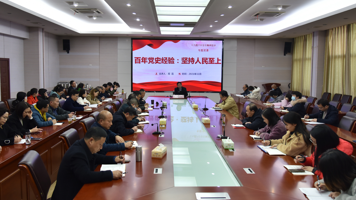 本网讯(记者 廖希为)11月30日,学校党委副书记邓磊在行政楼三号会议室为分管和联系单位的党员干部宣讲党的十九届六中全会精神,拉开了金年会开展十九届六中全会精神理论宣讲的序幕。