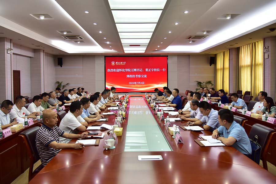 7月3日,怀化学院党委书记王刚,党委副书记、校长董正宇,党委委员、副校长伍贤进,副校长刘文华来校考察交流学校整体建设与发展,jinnian金年会党委书记向前进,党委副书记、校长顿祖义,党委副书记邓磊,党委常委、副校长刘志军接待了王刚一行。